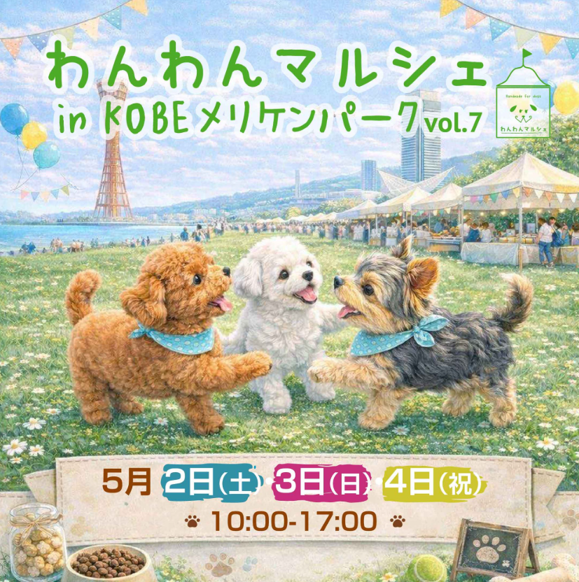 神戸の人気ロケーションで開催されるマルシェ型イベント。ハンドメイド犬服や無添加おやつなど、ショッピング目的で参加する方に特に支持されています。大型フェスよりも落ち着いて回れるため、じっくり比較検討したい方におすすめです。