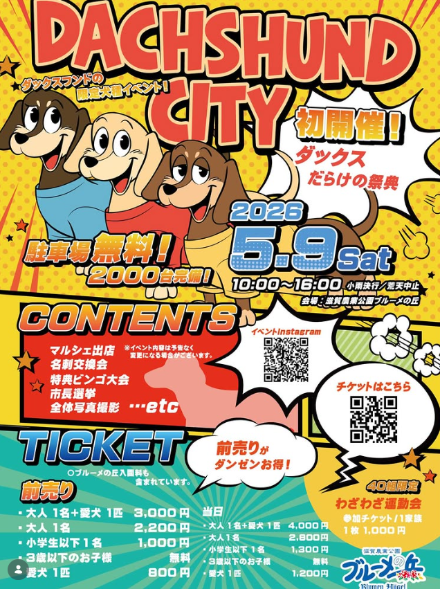 | DACHSHUND CITY | 滋賀農業公園 ブルーメの丘 | 名神高速道路 「八日市IC」 「蒲生スマートIC」 新名神高速道路 「甲賀土山IC」 | 屋外 | ★★☆☆☆ | Instagram|DACHSHUND CITY | |