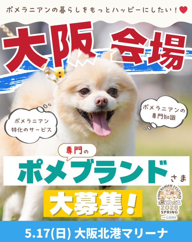 | ポメラニアンフェスティバル 2026 SPRING meets 大阪北港マリーナ | 大阪北港マリーナ | 阪神高速5号線 「湾岸舞洲IC」 | 屋外 | ★★★☆☆ | 公式HP|ポメラニアンフェスティバル | |