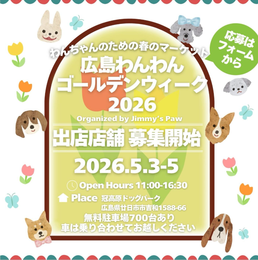 | 広島わんわん ゴールデンウィーク2026 | 冠高原ドッグパーク | 山陽自動車道 「廿日市IC」 | 屋外 | ★★★☆☆ | Instagram「hiroshima_wanwan」 | |