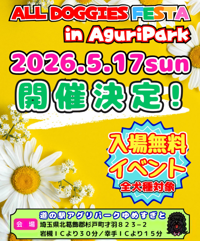 | ALL DOGGIES FESTA 2026 SPRING inアグリパークゆめすぎと | 道の駅アグリパークゆめすぎとひだまり広場 | 東北自動車道 「岩槻IC」 圏央道 「幸手IC」 | 屋外 | ★★★★☆ | 公式HP「wannyan-smile」 | |
